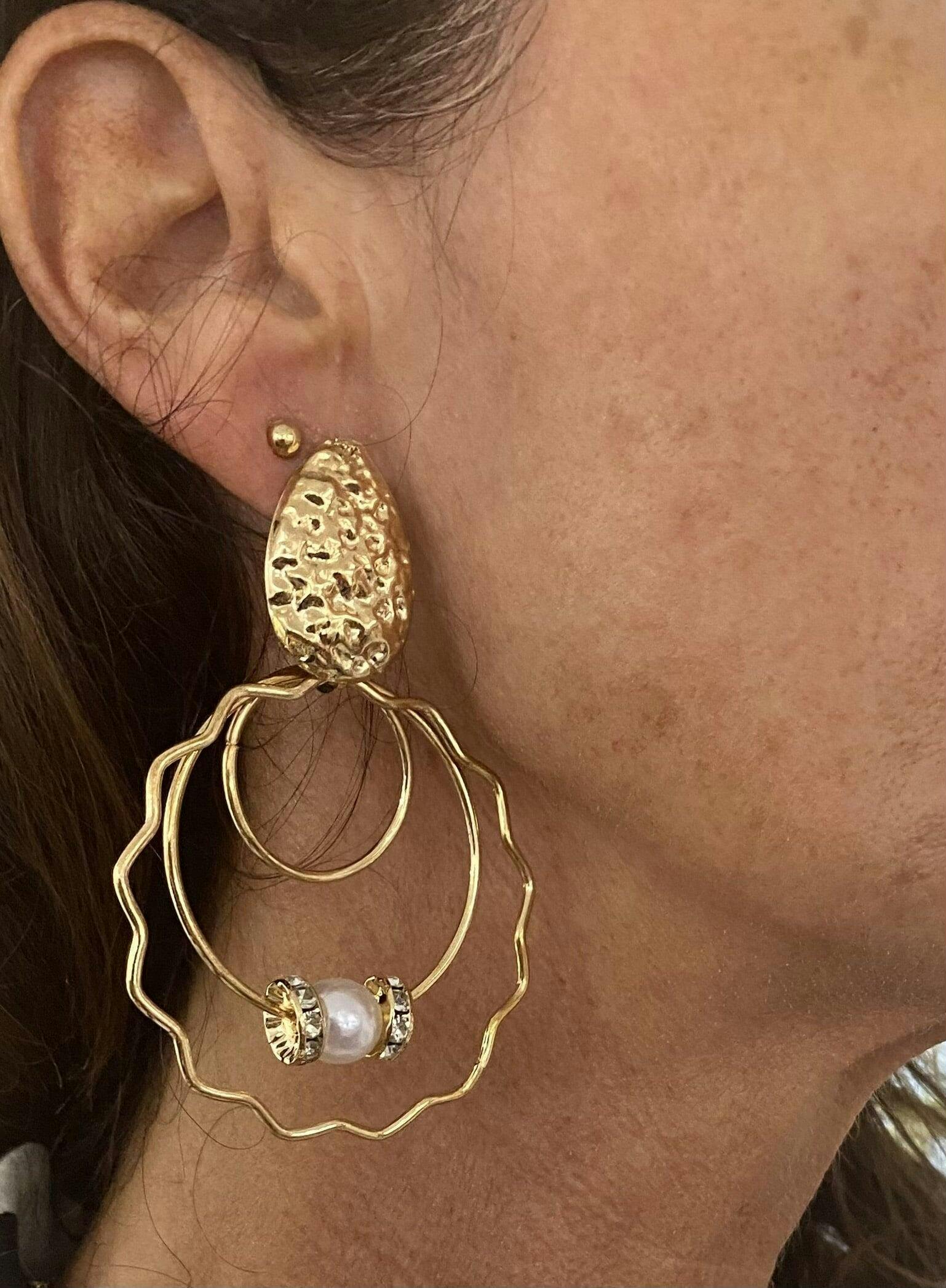 Les boucles d'oreilles "Aurum" incarnent l'élégance intemporelle avec leurs pendentifs en or finement martelés, qui captent la lumière à chaque mouvement. Les anneaux concentriques délicats ajoutent une sophistication subtile, complétée par des perles blanches nacrées, offrant une touche classique et raffinée. Mesurant 7,5 cm de longueur et 5,5 cm de largeur, elles sont disponibles avec tiges poussoirs ou crochets pour oreilles percées , ainsi que des clips pour oreilles non percées.