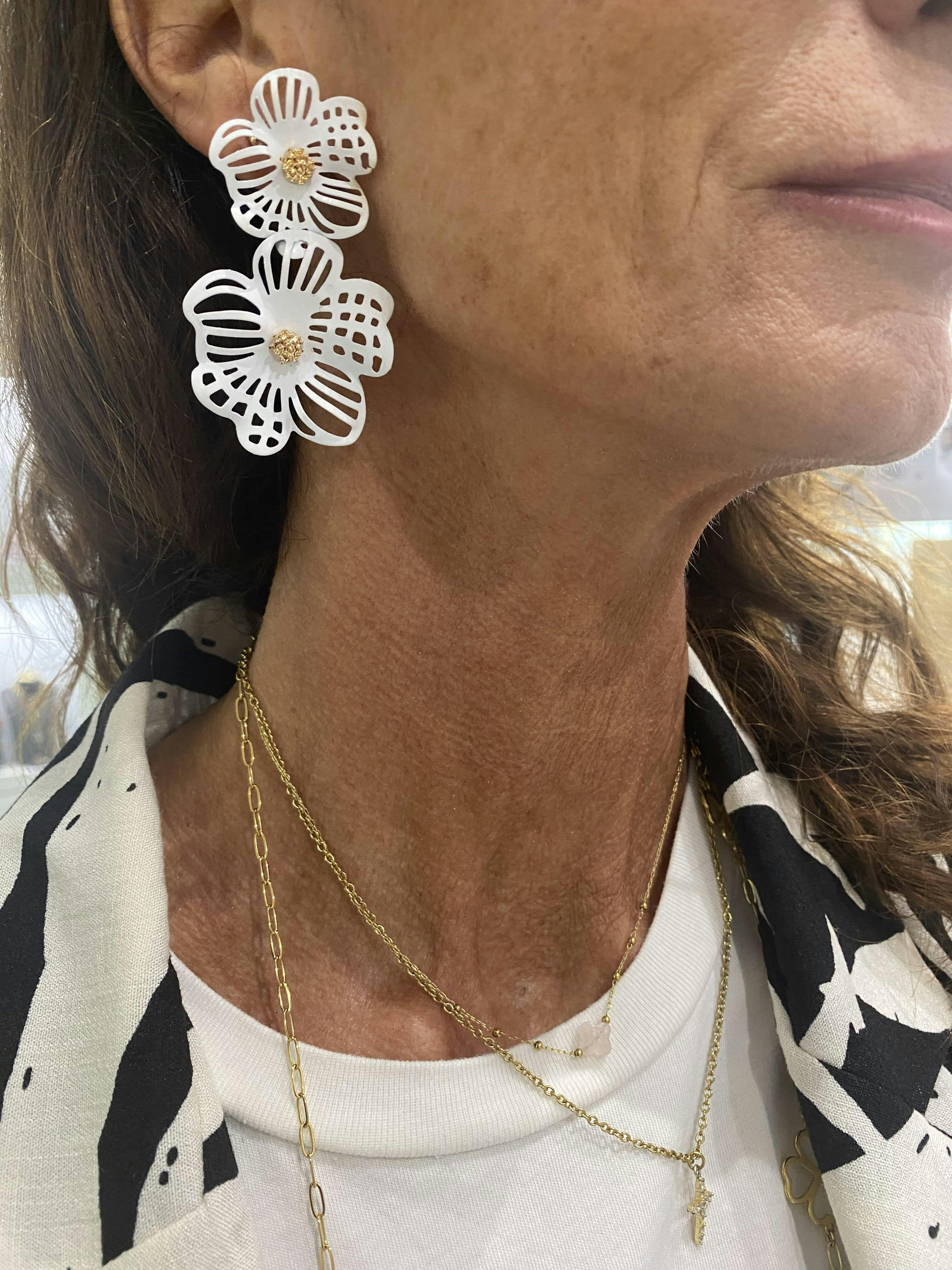 Les boucles d'oreilles "Lys" incarnent l'élégance absolue avec leurs fleurs blanches rappelant la pureté des lys. Chaque fleur est sublimée par un cœur scintillant en or jaune texturé, mesurant 6,5 cm de longueur et 4 cm de largeur. Confortables et légères, elles sont équipées de tiges poussoirs ou crochets pour oreilles percées, ainsi que de clips pour oreilles non percées, offrant un luxe et une sophistication inégalées.