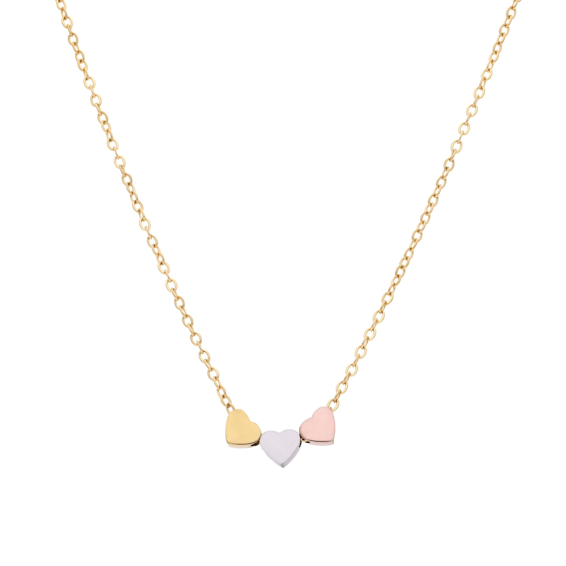 Le collier 'Melow Doré' se distingue par son trio de cœurs en acier inoxydable, chacun dans une teinte différente : doré, argenté et rose. Les pendentifs mesurent 1,5 cm de largeur, ajoutant une touche délicate et colorée à ce bijou raffiné. La chaîne dorée de 45 cm complète l'ensemble, offrant un éclat chaleureux et élégant. Parfait pour toutes les occasions, ce collier apporte une touche de sophistication à votre style quotidien ou à vos tenues de soirée.