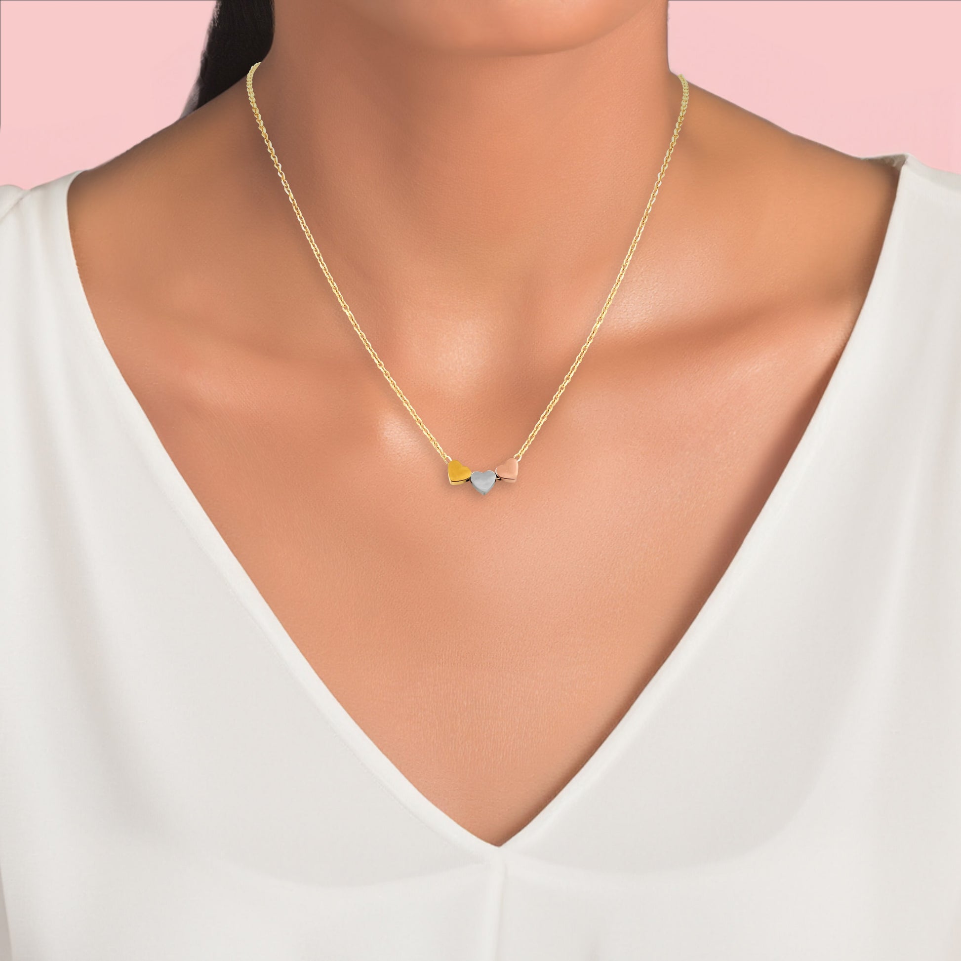 Élevez votre style avec le collier 'Melow Doré', un bijou élégant où les cœurs doré, argenté et rose se marient harmonieusement pour une allure sophistiquée.